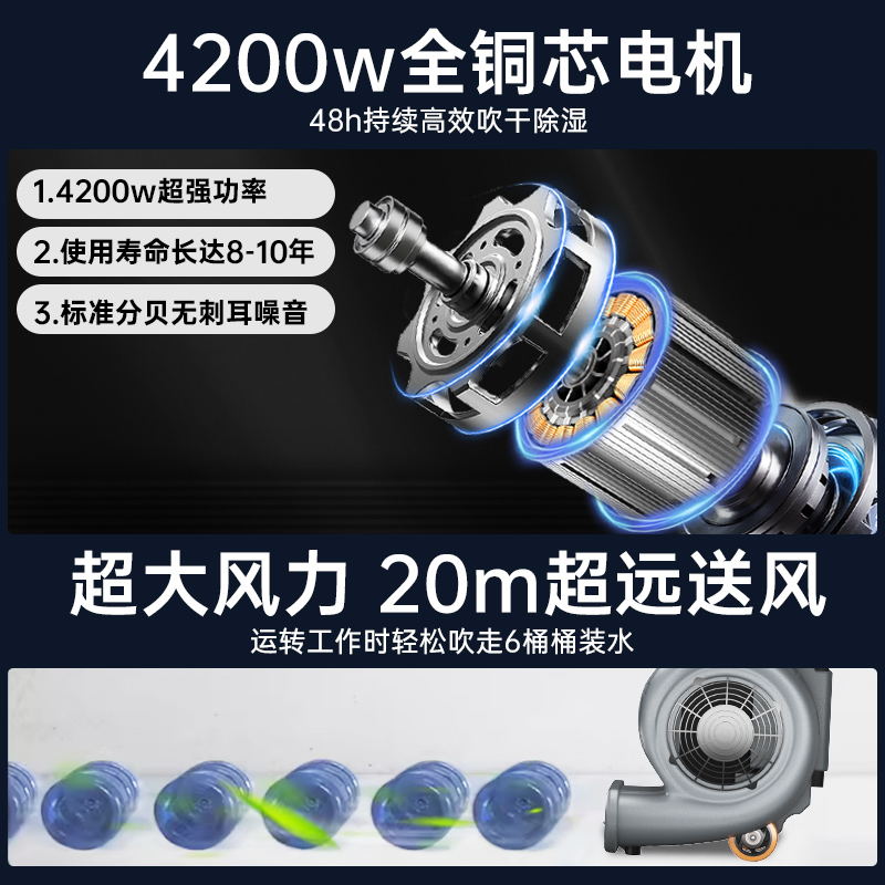 揚子YZ-CGJ001地面吹干機4200W冷熱雙風吹干效果高于自然風機,有限降低使用時間,6擋可調節橫掃潮濕通風排氣。
