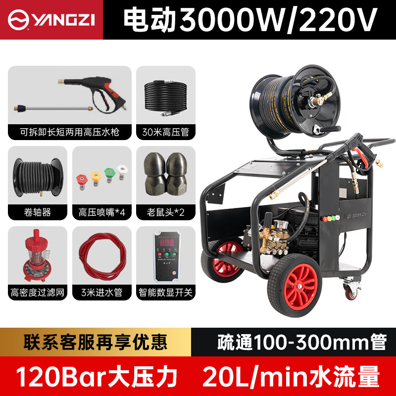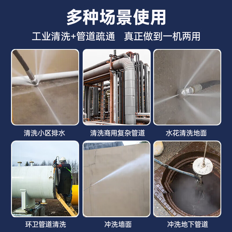 管道疏通機就選揚子,一臺機器兩種用處,配備3中型號噴頭,適用于多種場景應用,動力強水流大,通暢無阻拐彎無壓力